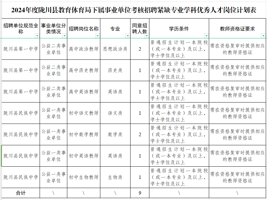 根據(jù)《關(guān)于同意縣教育體育局黨組使用編制通知單》(隴機(jī)編辦準(zhǔn)[2023]4號)及《隴川縣人力資源和社會保障局關(guān)于印發(fā)2024年教育衛(wèi)生部門考核招聘緊缺專業(yè)學(xué)科優(yōu)秀人才工作方案的通知》隴人社發(fā)〔2024〕2號文件精神,2024年隴川縣教體系統(tǒng)考核招聘緊缺專業(yè)學(xué)科優(yōu)秀人才9名,其中:隴川縣第一中學(xué)4名、隴川縣民族中學(xué)5名,F(xiàn)將有關(guān)事宜公告如下: