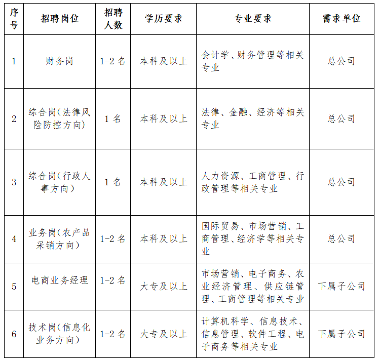現(xiàn)結(jié)合公司發(fā)展需求,計(jì)劃面向社會公開招聘財(cái)務(wù)、法務(wù)、行政、業(yè)務(wù)采銷、電商運(yùn)營、信息化技術(shù)崗位人才。