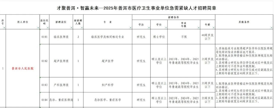 附件1+:2025年普洱市醫(yī)療衛(wèi)生事業(yè)單位緊缺急需人才招聘簡章+