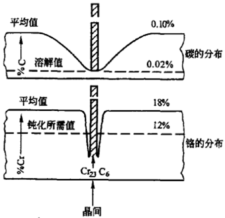 304碳含量不大于0.08%,1000 ℃以上碳固溶于奧氏體中,由于碳原子半徑小,所以溫度降低時碳原子沿著晶界析出。
