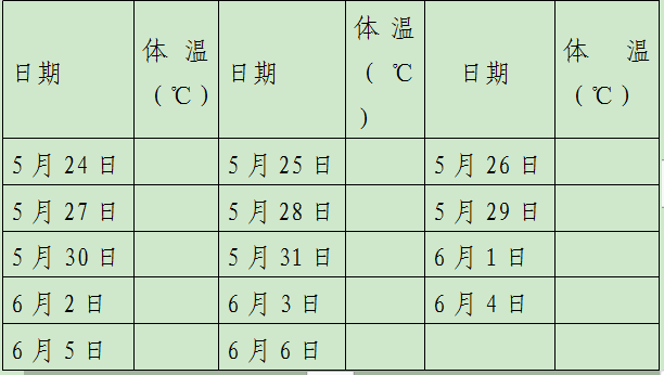 備注:1.考生應(yīng)按上表每日測量體溫、進(jìn)行健康監(jiān)測,如出現(xiàn)發(fā)熱、干咳、流涕等可疑癥狀應(yīng)及時(shí)就醫(yī)。2.入場攜帶本承諾書、核酸檢測證明連同彩打的云南健康碼、通信大數(shù)據(jù)行程卡交考點(diǎn)、考場查驗(yàn)。3.考生對所填內(nèi)容真實(shí)性負(fù)責(zé)。