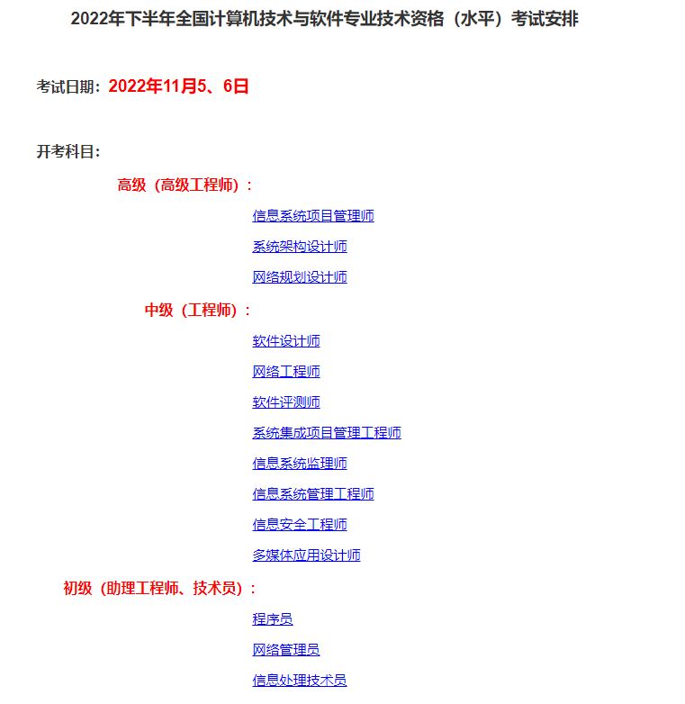 2、中級資格:軟件設計師、網絡工程師、軟件評測師、系統(tǒng)集成項目管理工程師、信息系統(tǒng)監(jiān)理師、信息系統(tǒng)管理工程師、信息安全工程師、多媒體應用設計師;
